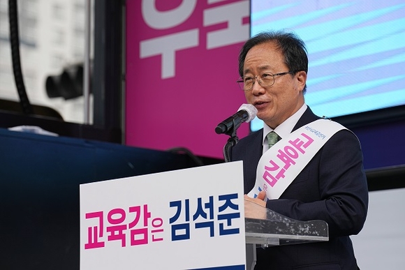김석준 부산시교육감 후보가 19일 오전 8시 송상현광장 앞에서 본격적인 선거운동을 시작하고, 유세 연설을 하고 있다. 이날 김 후보는 "이제 우리 부산교육은 과거교육으로 회귀할 것인지, 아니면 미래교육으로 나아갈 것인지 갈림길에 있다"며 "선거에서 반드시 승리해 우리 아이들의 미래와 부산교육의 미래를 활짝 열어가겠다"고 말하며 지지를 호소했다.(사진=김석준 부산시교육감 후보 선거캠프 제공)