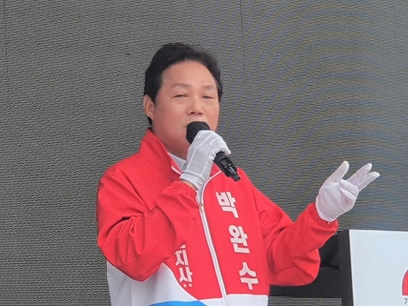 박완수 국민의힘 경남도지사 후보가 선거운동 첫날인 19일 오전 창원 의창구 창원광장 옆 최윤덕 장군 동상 앞에서 출정식을 갖고 유세 연설을 하고 있다. (사진=최원석 기자)