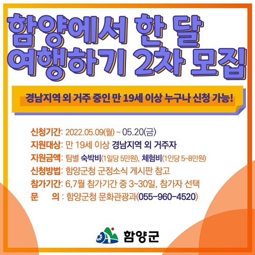 군 관계자는 “생활관광, 체류관광에 대한 관심도가 높아짐에 따라 함양에서 한 달 여행하기에 대한 문의가 꾸준히 이어지고 있어 참가자가 넉넉하게 여행에 참가 할 수 있도록 올해 7, 9월 추가 모집할 계획이다. 많은 분들이 신청하시어 지리산 청정지역인 함양의 매력적인 명소를 많이 구경하고 힐링 하시길 바란다”고 말했다.