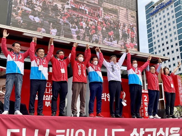 이어서 단상에 오른 박 후보는 광장에 모인 지지자들에게 손을 흔들며 감사의 말씀을 전했다. 그는 "지난 보궐선거에서도 저를 밀어주시고, 대통령 선거에서도 윤 대통령을 당선시켜주셔서 정권교체를 이뤄냈다"며 "감사의 마음은 일로써 보답하겠다. 지난 1년을 4년같이 뛰었다. 1년 만에 3조 7000억 기업투자유치를 이끌고, 12개 장기 표류 과제 모두 실마리를 풀고 해결의 길로 들어섰다"고 말해 지지자들의 호응을 이끌었다.