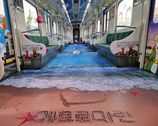 부산 도시철도 내부가 부산을 상징하는 조형물과 바다 이미지로 채워졌다.
