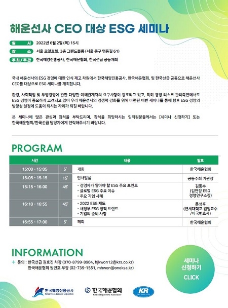한국해양진흥공사는 한국해운협회·한국선급과 함께 오는 6월 2일 서울 중구 로얄호텔에서 해운선사 CEO를 대상으로 공동으로 ESG 세미나를 개최한다고 밝혔다.