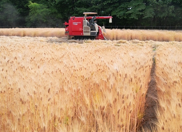 25일 경남 함양군 함양읍 상림공원 경관단지에서 한 인부가 콤바인을 이용해 누렇게 익은 청보리를 타작하고 있다. (사진=함양군 제공)