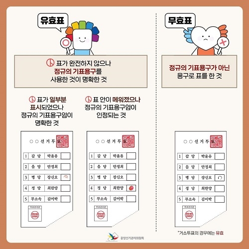 투표 시 일부만 기표됐거나 기표 안이 메워진 경우에도 정규의 기표 용구임이 명확하면 유효표로 인정된다. 다만, 정규의 기표용구가 아닌 용구로 기표한 경우에는 무효표가 된다.