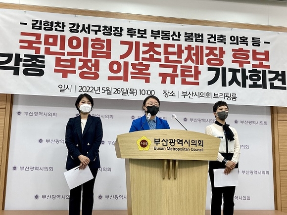 더불어민주당 부산시당은 26일 기자회견을 열고 "6·1 지방선거에 출마한 국민의힘 기초단체장 후보들의 각종 비리와 부정 의혹들이 터지고 있다"며 "국민의힘은 시민에게 사과하고, 후보들은 사퇴하라"고 촉구했다.