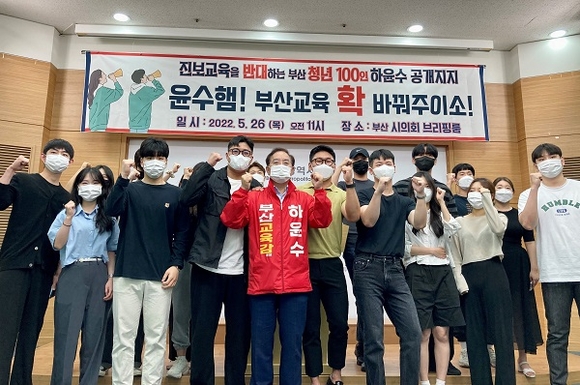 최혁준 등 부산 청년 100인은 26일 기자회견을 열고 "청년세대의 희망을 앗아간 김석준 후보의 진보교육 8년을 바로 잡아야 한다"며 하 후보 지지를 선언했다.