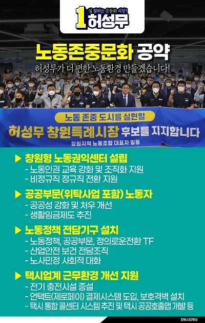 허성무 더불어민주당 창원시장 후보는 25일 창원형 노동권익센터 설립 등 노동정책 관련 공약을 발표하고 “노동존중도시 만들기에 최선을 다할 것”이라고 약속했다.