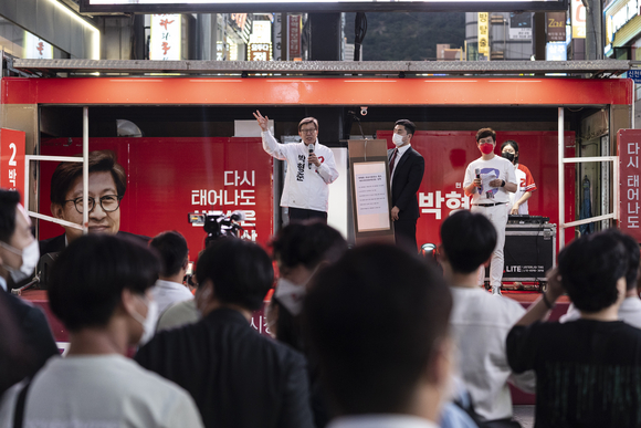 박 후보는 지난 26일 오후 7시 30분 서면 쥬디스태화 앞에서 WAVE2340 청년본부와 함께 MZ세대와 소통하기 위한 '청년문화 유세 데이트'를 가졌다.