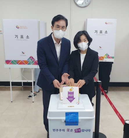 김상권 경남도교육감 후보가 6.1지방선거 사전투표 첫날인 27일 오전 창원 의창구 팔용동 행정복지센터를 방문, 부인 강명화 여사와 함께 소중한 한 표를 행사하고 있다. (사진=김상권 선거캠프 제공)