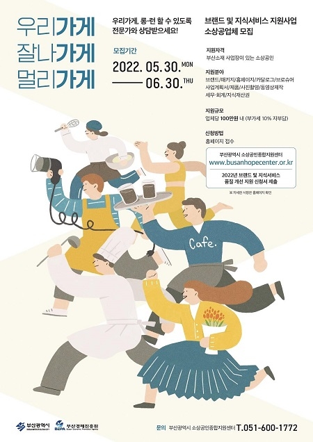 부산시는 오는 6월 30일까지 '함, 바까보까' 플랫폼을 통해 '소상공인 브랜드 및 지식서비스 품질 개선사업'에 참여할 지역 소상공인 총 400개 업체를 모집한다고 밝혔다.