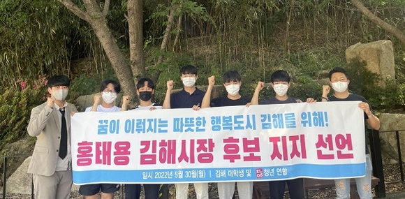 김해 대학생 60여명과 전국 각지의 청년들로 구성된 청년연합은 지난 30일 홍태용 국민의힘 김해시장 후보 지지선언을 가졌다.
