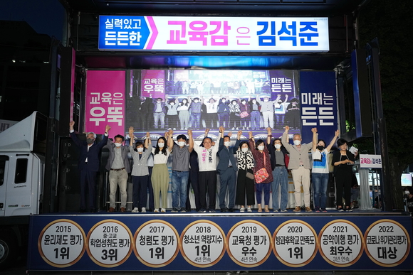 김석준 부산시교육감 후보가 31일 오후 7시 서면 NC백화점 앞에서 마지막 선거 유세를 하고 "이제 우리 부산교육은 과거교육으로 되돌아갈 것인지 미래교육으로 나아갈 것인지 중대한 갈림길에 서 있다"며 "아이들의 본보기가 돼야 할 교육감은 정직하고 청렴한 사람이어야 하고 공정하고 실력있는 사람이어야 한다"고 말했다.