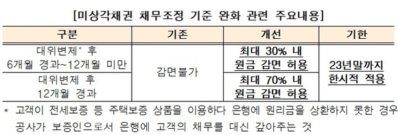 기존에는 상각채권에 한해서만 원금감면이 가능했으나, 앞으로는 일반채권(미상각채권)도 공사가 은행에 채무를 대신 갚아준(대위변제) 날로부터 12개월이 지나면 최대 70%(6개월 경과 시 최대 30%)까지 원금을 감면 받을 수 있다.