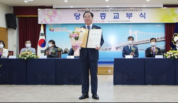 하윤수 부산시교육감 당선인이 2일 부산시선거관리위원회에서 당선증을 받고 기념촬영을 하고 있다. 하 당선인은 전 부산교대 총장, 교총 회장 등을 역임하고 출마한 이번 선거에서 팽팽한 접전 끝에 당선증을 거머쥐게 됐다. 부산시선관위는 이날 오전 하 당선인과 박형준 부산시장 당선인, 비례대표 5명에 대해 당선증을 교부했다. 구청장·군수, 부산시의원, 구·군의원, 비례대표 구·군의원의 당선증 교부식은 각 구군 선관위에서 교부했다.