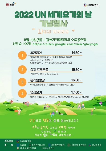 김해시 UN 세계 요가의 날 기념행사는 지난 2019년 주한인도대사(스리프리야 랑가나탄)의 제안으로 지난해 처음 열렸으며, 올해는 '나에게 다가가다'라는 주제로 김해시요가회가 주최·주관하고 김해시, 주한인도대사관, 주한인도문화원 등이 후원해 사전행사(2회)와 본행사로 나눠 진행된다.