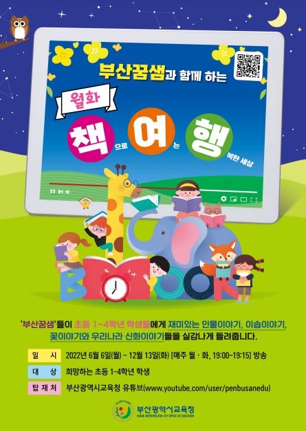 부산시교육청은 오는 6일부터 12월 13일까지 '부산꿈샘과 함께하는 월화 책·여·행(책으로 여는 행복한 세상)' 프로그램을 운영한다고 3일 밝혔다.