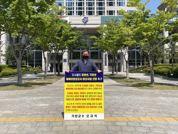 오규석 기장군수는 3일 오전 10시 30분경 도시철도 정관선·기장선 사업의 '2022년 예비타당성조사 대상사업 선정'촉구를 위해 부산시청 앞에서 1인 시위를 진행했다.