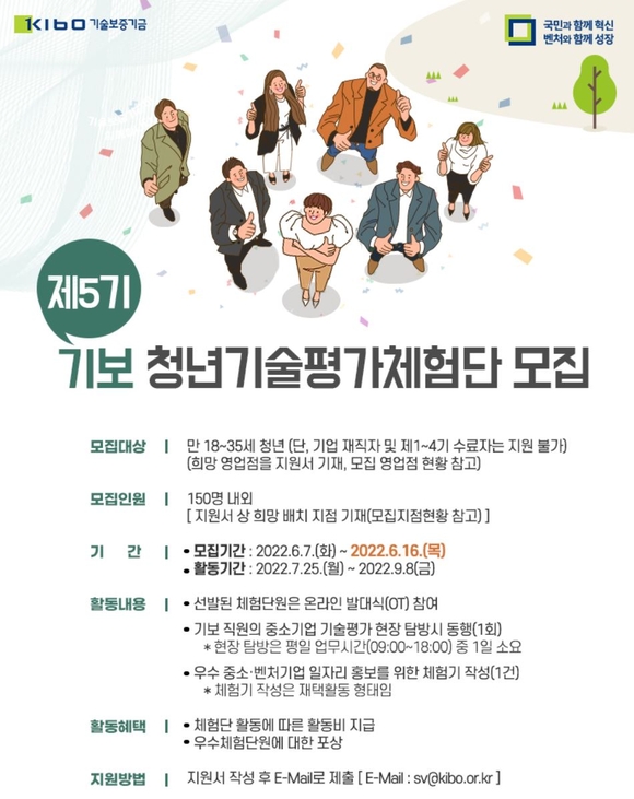 기술보증기금은 청년들이 우수 중소·벤처기업을 직접 탐방하고 중소기업 일자리 인식을 개선하기 위해 '제5기 청년기술평가체험단'을 오는 16일까지 모집한다고 7일 밝혔다.