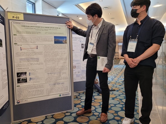국토안전관리원 직원들이 한국강구조학회 학술대회에서 발표한 논문 자료에 대해 살펴보고 있다. (사진=국토안전관리원 제공)