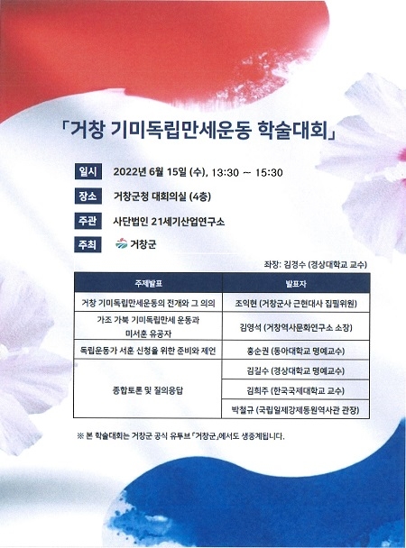 경남 거창군은 오는 15일 오후 1시 30분부터 군청 대회의실에서 거창 기미독립만세운동 학술대회를 연다.