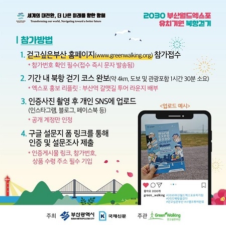 참가 방법은 걷고싶은부산 누리집에서 신청 후 참가번호가 적힌 문자를 확인하고, 행사기간 내 걷기코스를 완보하고 인증사진을 개인 SNS에 올리면 된다. 이후 구글 설문지 폼 링크를 통해 인증게시물 링크주소, 참가번호, 상품 수령 주소를 기입하면 된다.