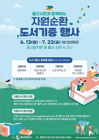 울산항만공사(UPA)는 ESG 경영 실천의 일환으로 13일부터 다음달 22일까지 약 6주간 '울산시민과 함께 하는 자원순환 도서기증 행사'를 개최한다고 13일 밝혔다.