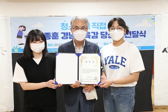 박종훈 경남도교육감이 지난 11일 마산청소년문화의집에서 청소년모의투표 경남운동본부의 '청소년이 직접 뽑은 교육감' 당선증을 받았다.