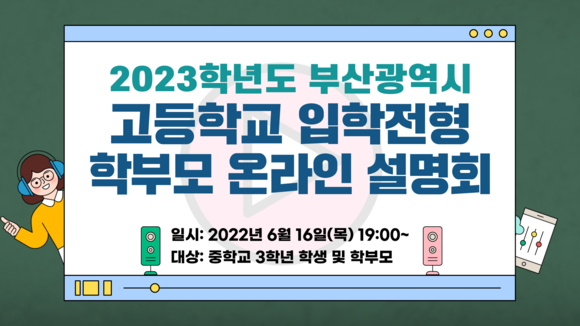 부산시교육청은 오는 16일 오후 7시 지역 중학교 3학년 학생 및 학부모를 대상으로 '2023학년도 고등학교 입학전형 온라인 설명회'를 개최한다고 밝혔다.