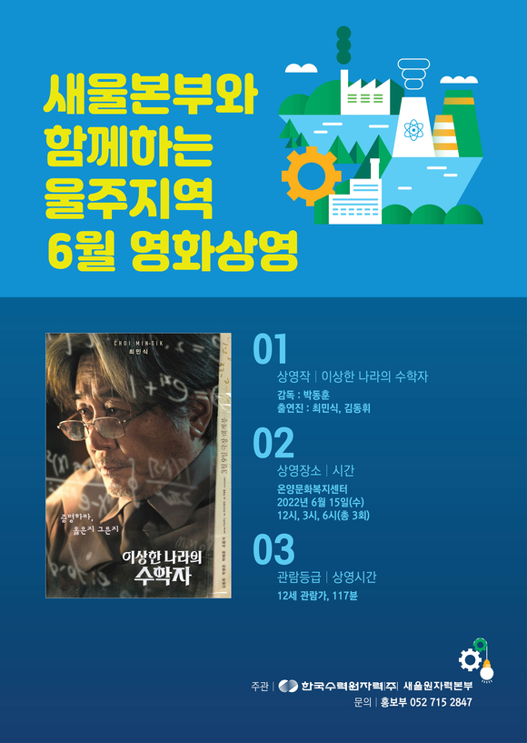 새울원자력은 오는 15일 울주군 온양읍 온양문화복지센터에서 오후 12시, 3시, 6시 총 3회에 걸쳐 영화 '이상한 나라의 수학자'를 무료로 상영한다.