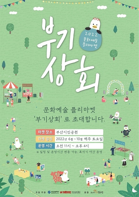 부산시는 오는 18일과 19일을 시작으로, 10월 말까지 매주 토요일 부산시민공원에서 문화예술 플리마켓 '부기상회'를 개최한다고 밝혔다.