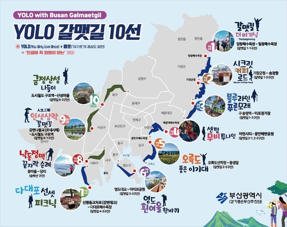 오는 22일 부산역에서는 부산을 방문하는 내·외국인 관광객을 대상으로 시 직원들이 직접 캠페인을 진행한다. 'YOLO 갈맷길 10선'을 집중 홍보하고, 부산역 갈맷길 투어 라운지도 운영해 전문 길잡이의 길 안내까지 들을 수 있도록 할 계획이다.