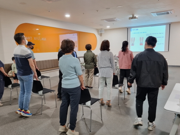 건강강좌에 참가한 스마트빌리지 입주민들은 웰니스센터 내 실내공간을 이용해 올바른 자세로 걷기를 연습하고 운동효과를 체험했다.
