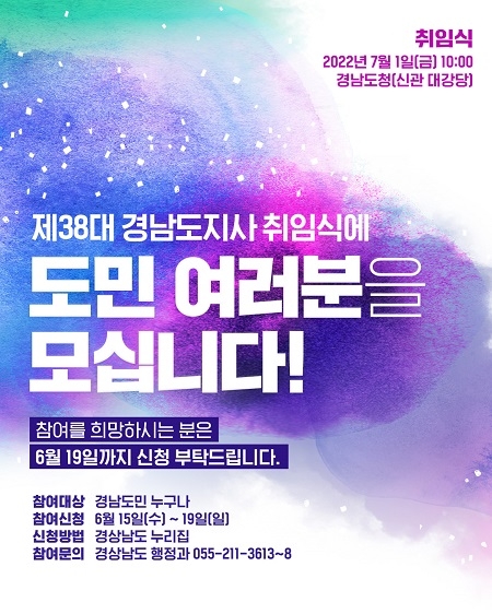 도 관계자는 “기존 초청인사 중심의 딱딱한 취임식 대신 도민과 함께하는 행사로 만들기 위해 온라인 신청을 받기로 했다”면서, “경남도민이면 누구나 참여 가능하다”고 말했다.