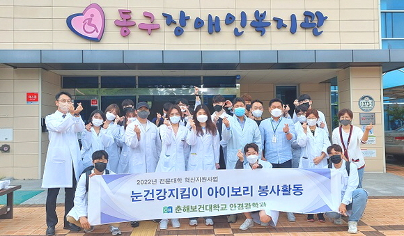 춘해보건대학교 안경광학과는 지난 15일 울산 동구장애인복지관에서 장애인 60여 명을 대상으로 시력측정 및 돋보기를 맞춰드리는 봉사활동을 펼쳤다.