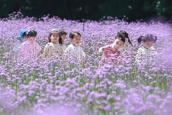 16일 경남 함양군 함양읍 상림공원 꽃밭에서 보랏빛 버들마편초가 활짝 펴 연꽃어린이집 원생들이 즐거운 시간을 보내고 있다. (사진=함양군 제공)