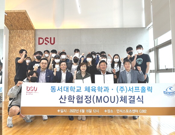 동서대학교 바이오헬스융합대학 체육학과와 서프홀릭이 최근 동서대 민석스포츠센터에서 산학협정 체결식을 가졌다고 20일 밝혔다.