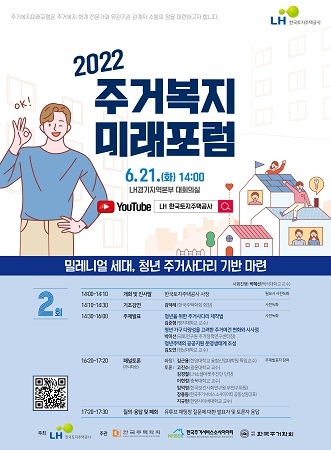 LH는 주거복지 전문기관으로서의 역할 강화를 위해 21일 LH 경기지역본부에서 한국주택학회, 한국주거서비스소사이어티, 한국주거학회와 함께 '2022년 제2회 주거복지 미래포럼'을 개최한다고 밝혔다.