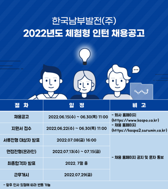최종합격자는 오는 7월 중 발표되며, 7월 29일부터 5개월간 근무한다. 인턴 지원은 모집 전용 누리집에서 가능하며, 기타 자세한 사항은 남부발전 누리집 채용정보 게시판에서 확인할 수 있다.