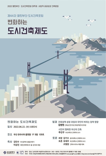 부산시는 오는 22일 오후 3시 부산유라시아플랫폼에서 '제44차 열린부산·도시건축포럼'을 개최한다고 밝혔다.