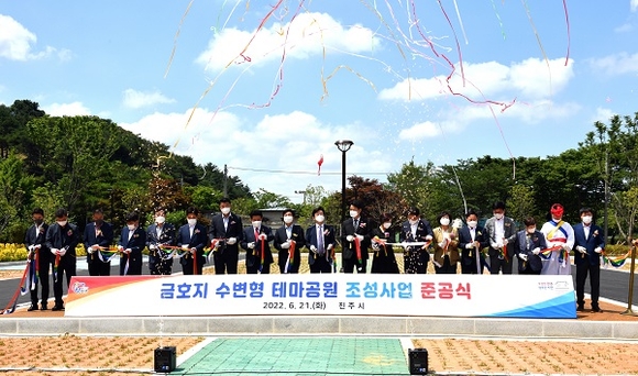경남 진주시는 21일 금호지를 찾는 시민들에게 볼거리와 휴식공간 제공을 위해 추진한 '금호지 수변형 테마공원 조성사업' 준공식을 가졌다.