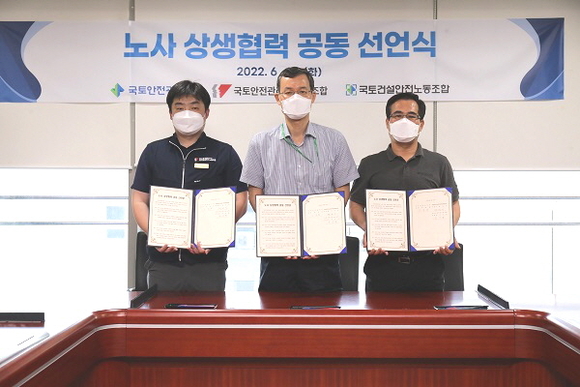 관리원 노사는 선언문을 통해 ▲안전하고 편리한 국토 조성에 기여하고 국민에게 신뢰받는 안전전문 공공기관이 되기 위한 적극적인 협력 ▲투명하고 청렴한 기관 운영 ▲행복한 일터를 만들기 위한 근로환경 개선 ▲상호 존중과 소통을 통한 열린 조직문화 및 상생협력의 노사관계 구축 등을 약속했다.