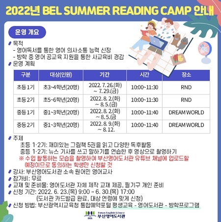 부산시립중앙도서관 분관 부산영어도서관은 오는 7월 26일부터 8월 12일까지 초등학교 3학년부터 중학교 3학년까지 80명을 대상으로 'BEL Summer Reading Camp'를 운영한다고 22일 밝혔다.