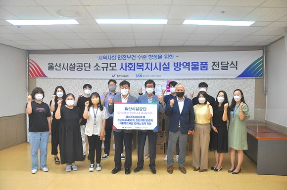 울산시설공단이 관내 소규모 복지시설에 방역물품을 전달하고 단체 기념촬영을 하고 있다. (사진=울산시설공단 제공)