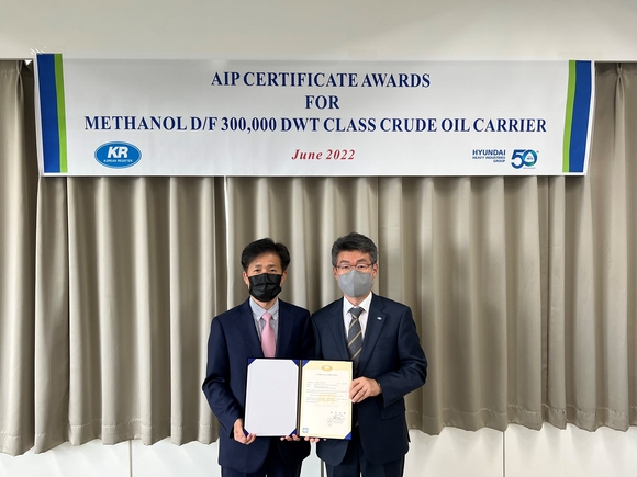 한국선급(KR)은 지난 16일 서울 종로구에 위치한 현대중공업 사옥에서 KR과 현대중공업그룹 관계자가 참석한 가운데 '메탄올 이중연료추진 300K 유조선'에 개념승인(AIP, Approval In Principle)을 수여했다고 밝혔다.