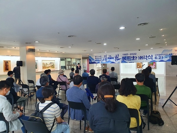 현대 판화의 새로운 가능성을 열어온 김준권 작가의 전시 개막식이 지난 21일 오후 4시 김해문화의전당 윤슬미술관 앞 특설마당에서 미술 관계자와 시민 등 100여 명이 참가한 가운데 성황리에 열렸다.