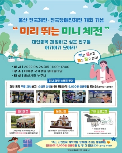 행사는 오전 11시 개막식에 이어 2022 전국체전 종목을 직접 체험하는 미니체전, 폐막식 순으로 오후 5시까지 이어지며, 울산시민 누구나 무료로 참여할 수 있다.