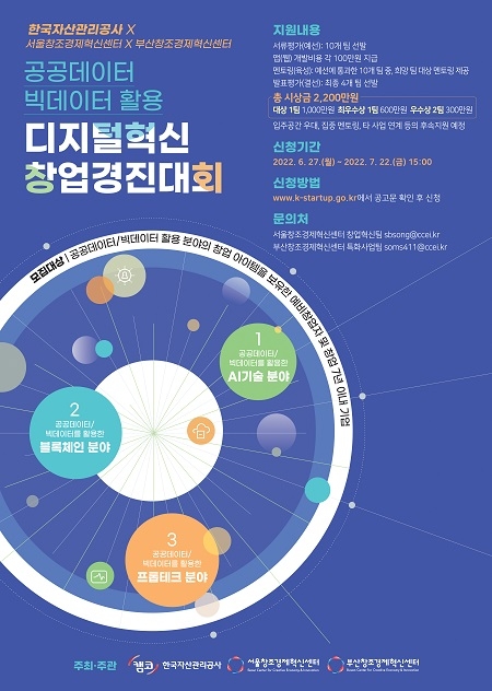 한국자산관리공사(캠코)는 서울·부산창조경제혁신센터와 공동으로 개최하는 '공공·빅데이터 활용 디지털 혁신 창업경진대회' 참가자를 오는 7월 22일까지 모집한다고 밝혔다.