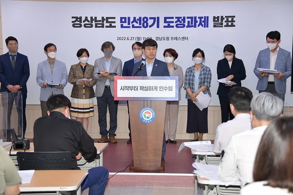 박완수 경남도지사 당선인의 '시작부터 확실하게 인수팀'이 오는 7월 1일 출범하는 민선8기 도정비전과 철학을 담은 도정과제를 발표했다.
