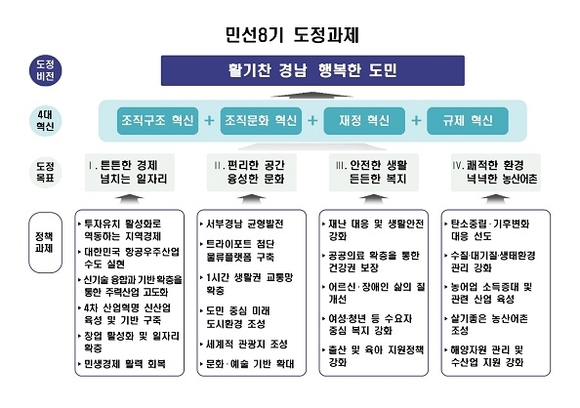 민선8기 도정과제는 경제회복과 일자리 창출에 초점을 맞추고, 균형발전·도민안전·사각지대 없는 복지 등에 많은 비중을 뒀다.