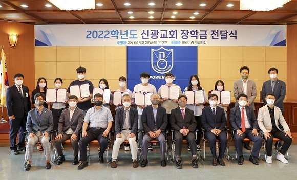 이어 박재윤 교학부총장은 “지역사회에 대한 사랑과 이웃 섬김을 실천하며 13년 간 꾸준히 장학금을 전달해주신 진창설 목사님을 비롯한 신광교회에 감사드린다”며 “학생들이 오늘 장학금의 특별한 의미를 잘 새겨 훌륭한 인재로 거듭날 수 있도록 다양한 지원을 아끼지 않을 것”이라고 화답했다.